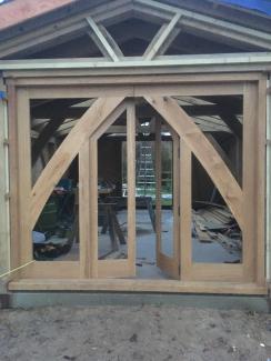 Oak Barn This project i designed and built for friends in wiltshire, with the center bay roof being all glass, oversized glass rear wall and four opening gate, pedestrian doors at the front, it's a lovely light space, with a woodburner at the back.